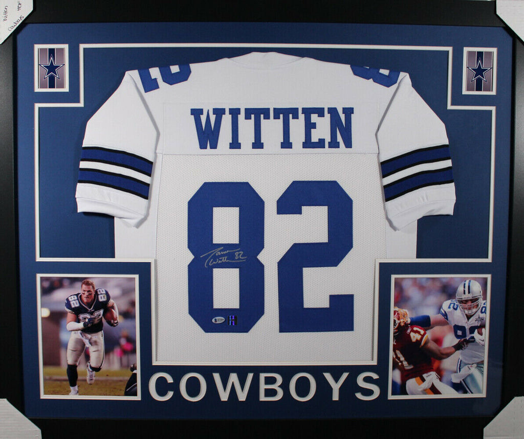 Jason Witten Autographed Dallas Cowboys Framed White XL Jersey BAS 17690 This is a professionally framed custom size XL white jersey with sewn on name and numbers that was personally autographed by Jason Witten. This jersey measures approximately 42" x 34" and includes a certificate of authenticity from Beckett Authentication Services (BAS) and Denver Autographs.