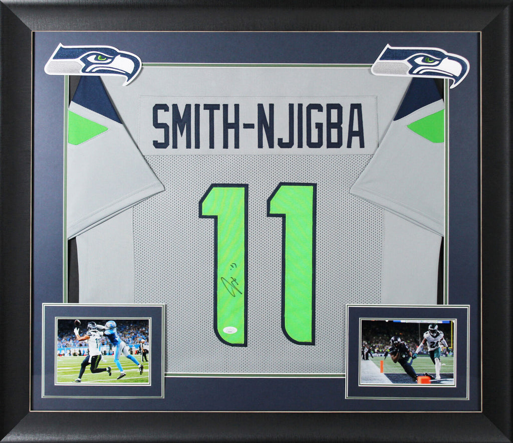 This Autographed Grey Pro Style Framed Jersey has been Personally Signed by Jaxon Smith-Njigba of the Seattle Seahawks. This item is 100% Authentic to include a Certificate of Authenticity (COA) / hologram by JSA. We have multiples of this same item. While the photographs are representative of this item, the size, placement and strength of the signature may vary. Each item is hand signed, therefore, each autograph is unique. This item has been professionally framed to overall dimensions of approximately 32 x 37 inches. This is a X-Large sized, non-branded, custom-stitched Framed Jersey. This jersey will be framed to order, it will take 3-4 days from purchase date for it to ship.