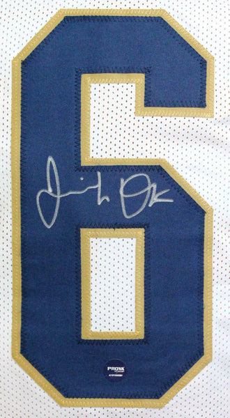 Jeremiah Owusu-Koramoah Autographed White College Style Jersey- Prova *Silver THIS IS NOT AN NCAA JERSEY. THIS HAS NO TAGS, NO LOGOS, NO EMBLEMS. This is a Jeremiah Owusu-Koramoah of Notre Dame Fighting Irish hand autographed custom made (Non Name Brand) authentic style (Stitched Letters and Numbers) jersey. This item has a Prova Authentication, which comes with a numbered sticker and a matching Prova Certificate of Authenticity. You can view this item on the Prova authentication website. It was signed either at a public autograph appearance or a private signing. Although you may not receive this exact item, the item you receive is virtually identical, brand new, and in great shape. Jersey size is XL.