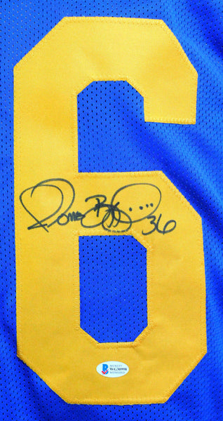 Jerome Bettis Autographed Blue/Yellow Pro Style Jersey - Beckett W Auth *Black THIS IS NOT AN NFL JERSEY. THIS HAS NO TAGS, NO LOGOS, NO EMBLEMS. This is a hand autograph of Jerome Bettis on a Custom Made (non-name brand) Authentic Style Jersey with stitched letters and numbers. This item has a Beckett Witnessed Authentication, which comes with a numbered and a matching Beckett Certificate of Authenticity. You can view this item on the Beckett Authentication website and it shows when and where the item was signed. It was signed either at a public autograph appearance or a private signing. This is a stock photo of the item. Although you may not receive this exact item, the item you receive is virtually identical and brand new in great shape. Jersey size is XL.