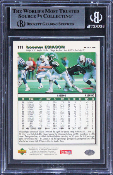 This Autographed 1995 Collector's Choice #111 Card has been Personally Signed by Boomer Esiason of the New York Jets. This item is 100% Authentic, it comes slabbed and authenticated by Beckett Authentication Services. The authenticity can be verified on Beckett Authentication Services website.