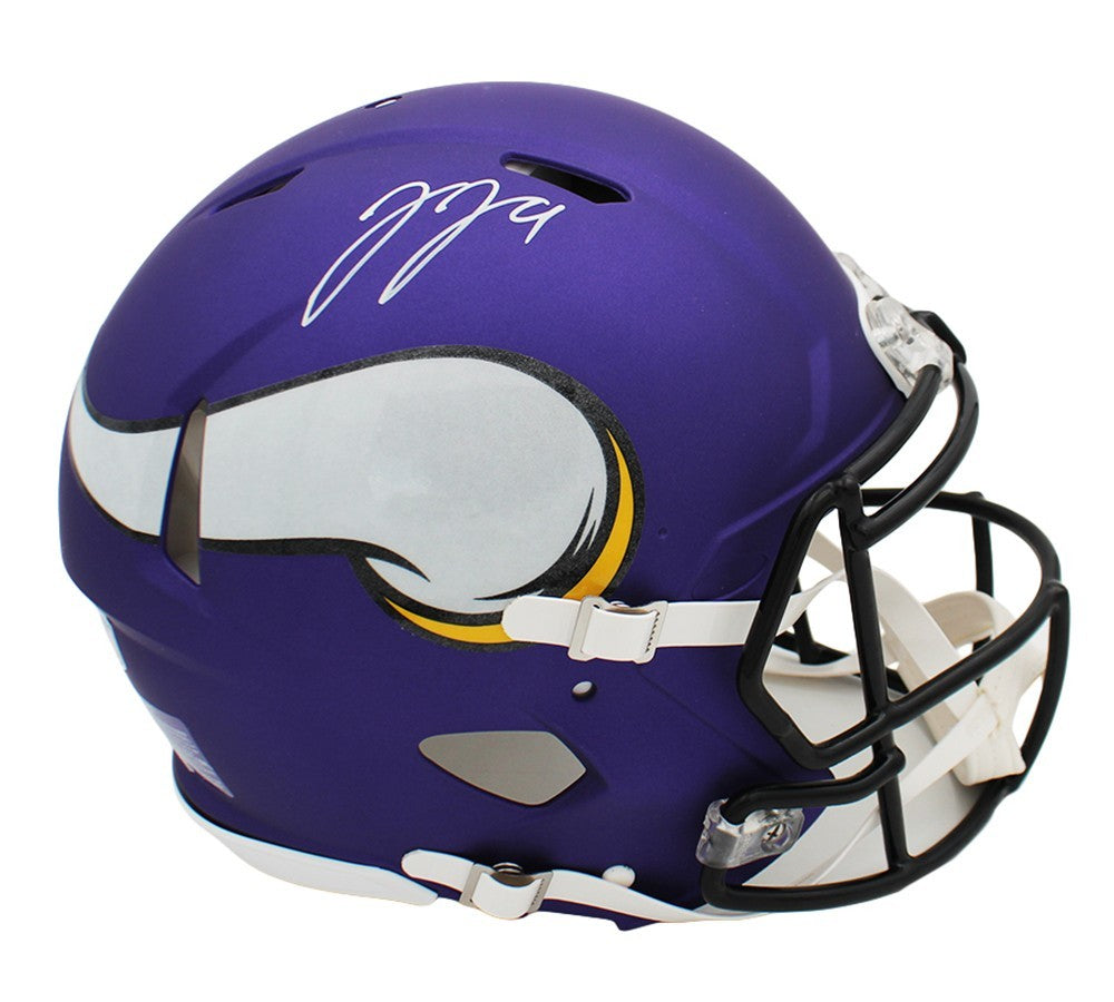 A Minnesota Vikings Speed Authentic NFL Helmet hand signed by JJ McCarthy. The item and signature are in excellent condition. JJ is a football quarterback who was drafted into the NFL in 2024 after playing college for the Michigan Wolverines. He was the Rose Bowl Offensive MVP and Big 10 Quarterback of the year. AUTHENTICATION: The item is tagged with a Beckett Serial Numbered and Databased Hologram.