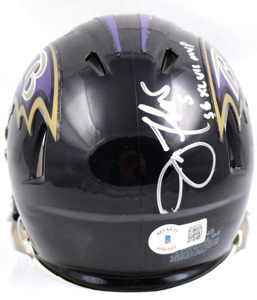 Joe Flacco Autographed Baltimore Ravens Speed Mini Helmet w/SB MVP-Beckett W Hologram *Silver This is a hand autographed Helmet of Joe Flacco of the Baltimore Ravens. This is a Riddell Football Speed Mini Helmet. Inscribed with SB MVP. This item has a Beckett Witnessed Authentication, which comes with a numbered hologram and a QR code for verification. You can view this item on the Beckett Authentication website. It was signed either at a public autograph appearance or a private signing. This is a stock photo of the item. Although you may not receive this exact item, the item you receive is virtually identical and brand new in great shape.