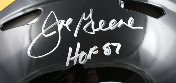 Joe Greene Autographed Pittsburgh Steelers 63-76 Speed Authentic F/S Helmet w/ HOF-Beckett W Hologram *Silver This is a Joe Greene of the Pittsburgh Steelers hand autographed Riddell football 63-76 Speed Authentic full size helmet inscribed with "HOF". This item has a Beckett Witnessed Authentication, which comes with a Beckett numbered hologram and a QR code for verification. You can view this item on the Beckett Authentication website, it shows when and where the item was signed. It was signed either at a public autograph appearance or a private signing. This is a stock photo of the item. Although you may not receive this exact item, the item you receive is virtually identical, brand new, and in great shape.