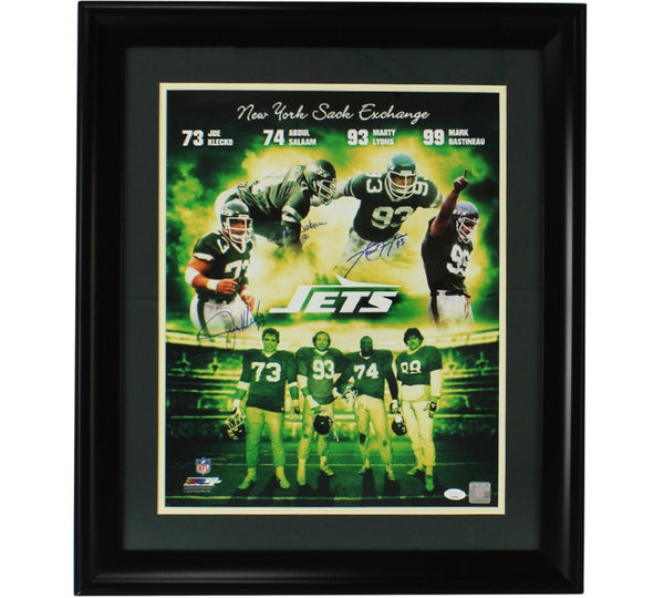 A New York Jets Framed 16x20 Sack Exchange Collage NFL Photo hand signed by Joe Klecko, Marty Lyons and Abdul Salaam. The item and signatures are in excellent condition. The frame measures approximately 28x24. AUTHENTICATION: The item is accompanied by a JSA Certificate of Authenticity - JSA Serial Numbered Hologram -