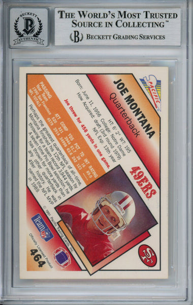 Joe Montana Autographed 1991 Pacific #464 Trading Card Beckett 10 Slab 37589 The number in the listing title is just an inventory sku for our records and is not the authentication number. The item pictured is a stock photo unless otherwise noted. This is a trading card that was personally autographed by Joe Montana. This has been professionally slabbed by Beckett Authentication Services (BAS) and includes a certificate of authenticity from Denver Autographs.