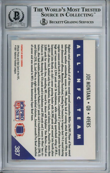 Joe Montana Autographed 1991 Pro Set #387 Trading Card Beckett 10 Slab 37591 The number in the listing title is just an inventory sku for our records and is not the authentication number. The item pictured is a stock photo unless otherwise noted. This is a trading card that was personally autographed by Joe Montana. This has been professionally slabbed by Beckett Authentication Services (BAS) and includes a certificate of authenticity from Denver Autographs.