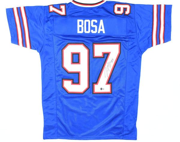 THIS IS NOT AN NFL JERSEY. THIS HAS NO TAGS, NO LOGOS, NO EMBLEMS. This is a hand autograph of Joey Bosa of the Buffalo Bills on a Custom Made (non-name brand) Authentic Style Jersey with stitched letters and numbers. This item has a Beckett Witnessed Authentication, which comes with a Beckett numbered hologram and a QR Code for verification. You can view this item on the Beckett Authentication website. It was signed either at a public autograph appearance or a private signing. This is a stock photo of the item. Although you may not receive this exact item, the item you receive is virtually identical and brand new in great shape. Jersey size is XL. THIS IS NOT AN NFL JERSEY. THIS HAS NO TAGS, NO LOGOS, NO EMBLEMS. This is a hand autograph of Joey Bosa of the Buffalo Bills on a Custom Made (non-name brand) Authentic Style Jersey with stitched letters and numbers. This item has a Beckett Witnessed Authentication, which comes with a Beckett numbered hologram and a QR Code for verification. You can view this item on the Beckett Authentication website. It was signed either at a public autograph appearance or a private signing. This is a stock photo of the item. Although you may not receive this exact item, the item you receive is virtually identical and brand new in great shape. Jersey size is XL.