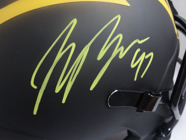 This is a hand autograph of Joey Bosa of the Los Angeles Chargers on a Riddell Football Full Size Eclipse Speed Replica Helmet. This item has a Beckett Witnessed Authentication, which comes with a numbered sticker and a matching Beckett Certificate of Authenticity. You can view this item on the Beckett Authentication website, and it shows when and where the item was signed. It was signed either at a public autograph appearance or a private signing. This is a stock photo of the item. Although you may not receive this exact item, the item you receive is virtually identical and brand new in great shape. This is a hand autograph of Joey Bosa of the Los Angeles Chargers on a Riddell Football Full Size Eclipse Speed Replica Helmet. This item has a Beckett Witnessed Authentication, which comes with a numbered sticker and a matching Beckett Certificate of Authenticity. You can view this item on the Beckett Authentication website, and it shows when and where the item was signed. It was signed either at a public autograph appearance or a private signing. This is a stock photo of the item. Although you may not receive this exact item, the item you receive is virtually identical and brand new in great shape.