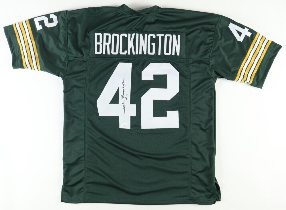 Custom on-field style jersey. Everything sewn on, size XL. Hand-signed by John Brockington (Died 2023, Green Bay Packers, Kansas City Chiefs).The lot / autograph(s) includes an official James Spence Authentication (JSA) hologram for authenticity purposes. The signing of this item was witnessed by JSA.Authentication: JSA HologramShop our Ebay store / Friendly Confines Collectibles for thousands of different autographed jerseys