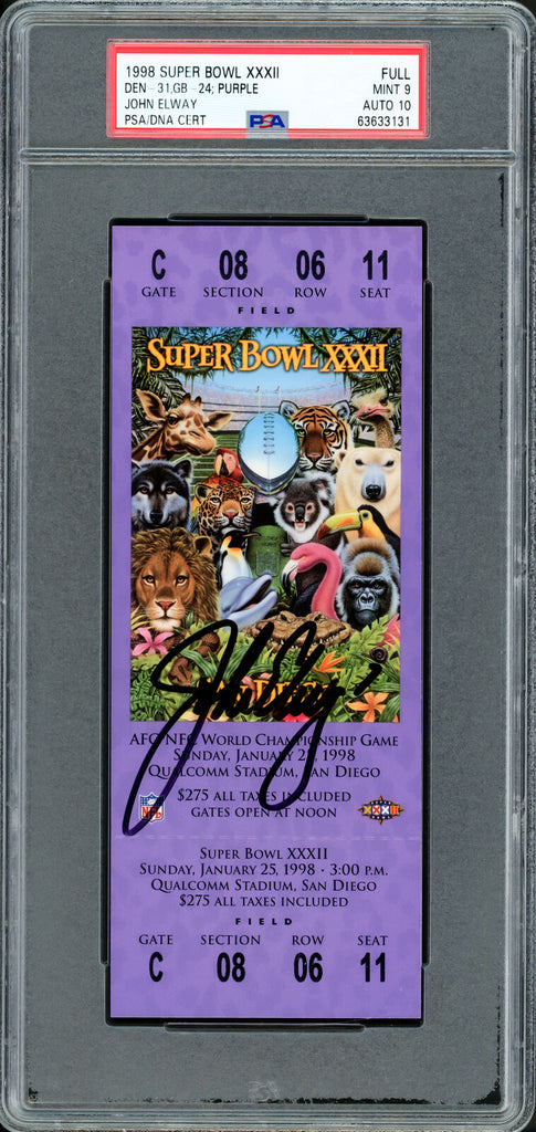 This is a 1998 Super Bowl XXXII Ticket, approximately 2.75"x6.5" in size, that has been hand signed by John Elway. The condition of this item was graded a Mint 9 by PSA. The condition of the signature was graded a Gem Mint 10 by PSA/DNA. It has been certified authentic by PSA/DNA and comes encapsulated in their tamper-proof holder.