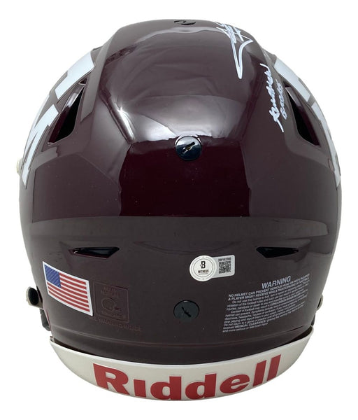 Featured is a Johnny Manziel signed Texas A&M Aggies full size authentic SpeedFlex helmet, inscribed "12 Heisman", "Johnny F...g Football", and "American Bad...". This helmet has been hand signed by Manziel and comes with the Beckett hologram and certificate of authenticity. This helmet would make a great addition to any sports memorabilia collection! SPECIFICATIONS Autographed By: Johnny Manziel Team: Texas A&M Aggies Sport: Football Authentication: Beckett