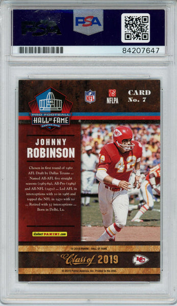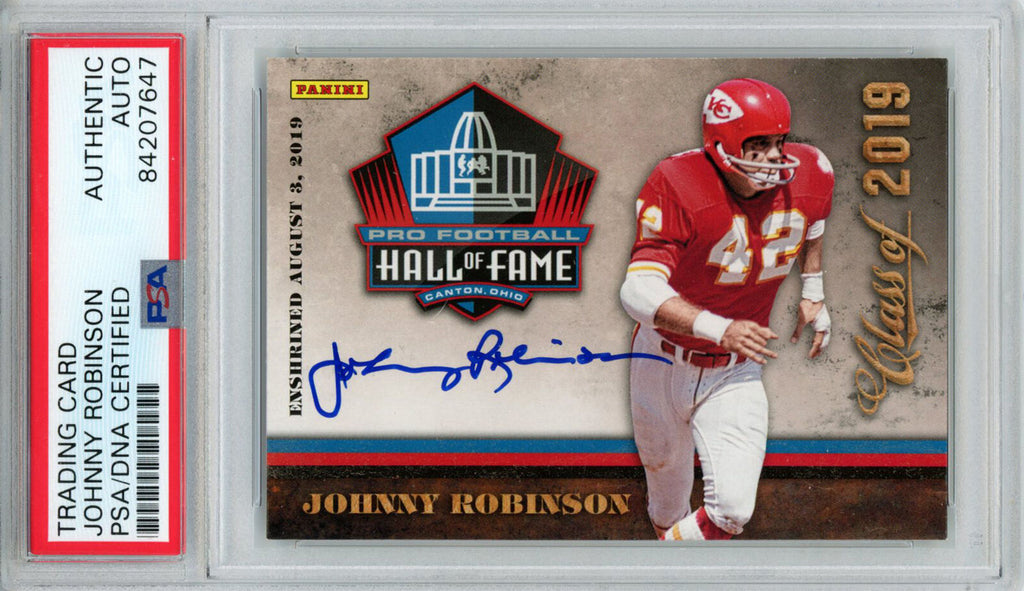 Johnny Robinson Autographed 2019 Panini Hall Of Fame Trading Card PSA 32997 The number in the listing title is just an inventory sku for our records and is not the authentication number. This is a 2019 Panini Hall of Fame trading card that was personally autographed by Johnny Robinson. This has been slabbed by Professional Sports Authentication (PSA) and includes a certificate of authenticity from Denver Autographs.