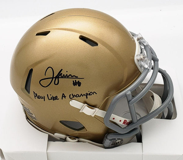 This autographed mini helmet has been personally hand-signed by Jordan Faison "Play Like A Champion" of the Notre Dame Fighting Irish.This autograph is certified by Players Ink. It comes with the numbered authentication scannable hologram with a QR code that verifies the authentication on the Players Ink website. Scan the QR code with your mobile phone to verify the authenticity.