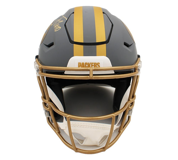 A Green Bay Packers Speed Flex Authentic Slate NFL Helmet hand signed by Jordan Love. The item and signature are in excellent condition. Jordan is a football quarterback for the Green Bay Packers drafted in the 2020 NFL Draft. AUTHENTICATION: Your item is tagged with a SmarTag Powered by Prova Technology, which gives you digital access to your items authentication records, including a proof picture from the signing.