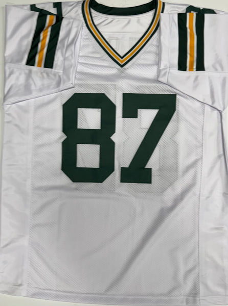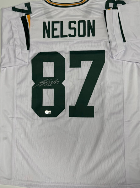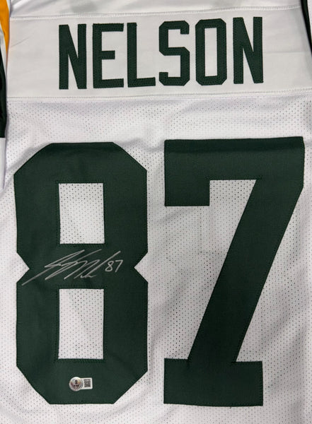 Custom Replica Jersey hand signed by Green Bay Packers Super Bowl XLV Champ JORDY NELSON. The signature is in Silver Paint pen. This jersey was signed at a private signing with us and would make a great addition to any Packers collection! The jersey size is XL and all letters and numbers are sewn in. This autograph is guaranteed to be 100% authentic and will include a COA from Beckett Authentication.