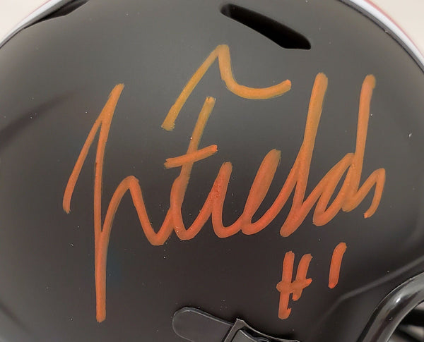 This is an Ohio State Buckeyes Eclipse Black Speed Mini Helmet that has been hand signed by Justin Fields. This item has been certified authentic by Beckett Authentication (BAS) and comes with their serial numbered sticker and matching certificate of authenticity.