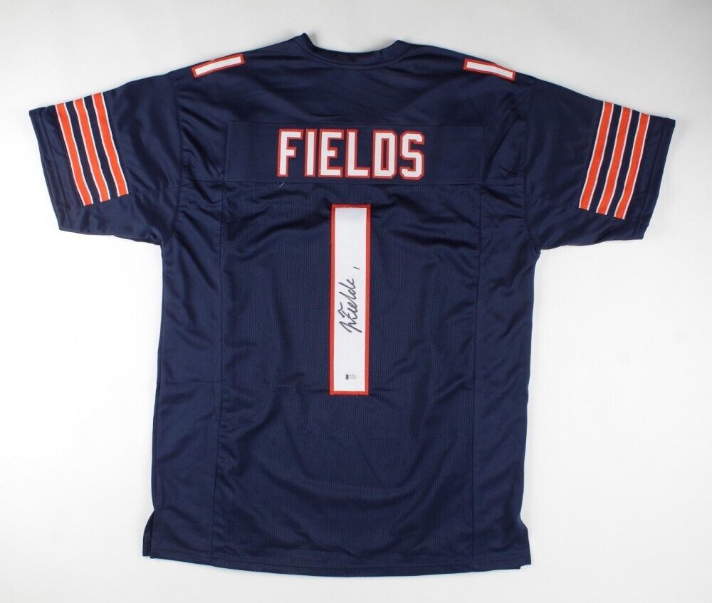 Custom on-field style jersey. Everything sewn on, size adult XL. Has been hand-signed by Justin Fields.The lot / autograph(s) includes an official Beckett Authentication Services serially numbered hologram and QR Code card for authenticity purposes.Authentication: Beckett Hologram with QR Code Card