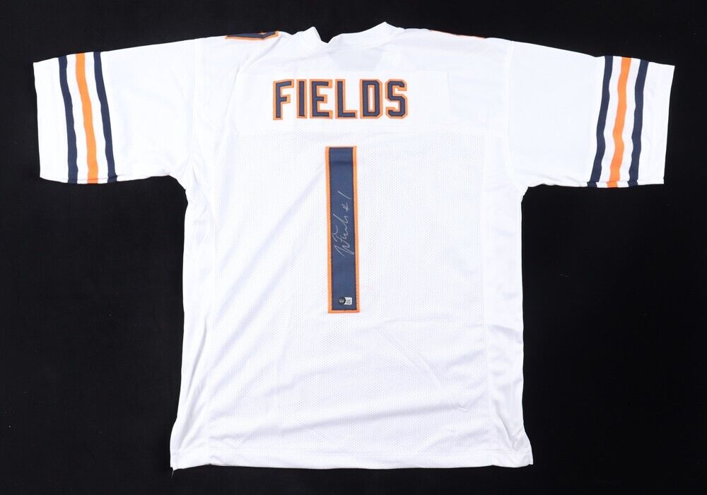 Custom on-field style jersey. Everything sewn on, size adult XL. Has been hand-signed by Justin Fields.The lot / autograph(s) includes an official Beckett Authentication Services serially numbered hologram and QR Code Card for authenticity purposes.Authentication: Beckett Hologram & QR Code Card