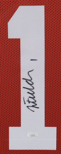 Custom frame measures 35" x 43" in size and features a jersey that has been hand-signed by Justin Fields.The autograph(s) includes an official James Spence Authentication (JSA) "Signature Debut" hologram and COA. "Signature Debut" is the autographed memorabilia equivalent to a rookie card. The JSA definition of a "Signature Debut" is as follows: "Any item that is autographed and received by JSA prior to the last game of the signer's official rookie season.Authentication: JSA COA