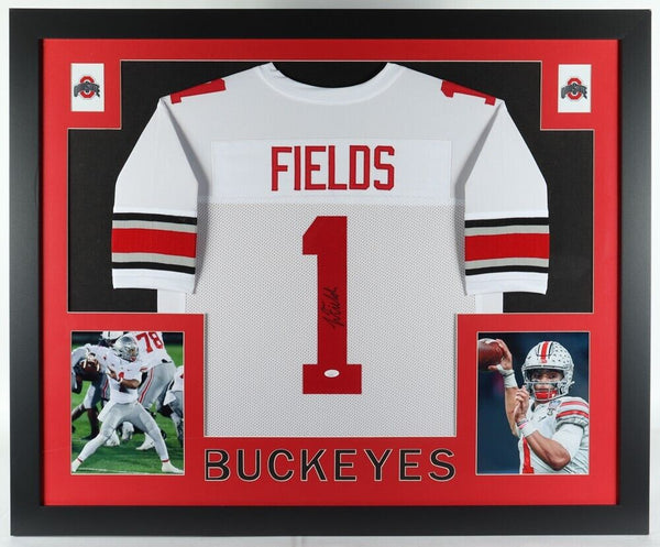 Custom frame measures 35" x 43" in size and features a jersey hand-signed by Justin Fields.The lot / autograph(s) includes an official James Spence Authentication (JSA) hologram and QR Code card for authenticity purposes. The signing of this item was witnessed by JSA.Authentication: JSA Hologram with QR Code card