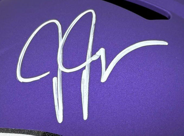 Featured is a Justin Jefferson signed Minnesota Vikings full size replica speed helmet. This helmet has been hand signed by Jefferson and comes with the Beckett hologram and certificate of authenticity. This helmet would make a great addition to any sports memorabilia collection! SPECIFICATIONS Autographed By: Justin Jefferson Team: Minnesota Vikings Sport: Football Authentication: Beckett