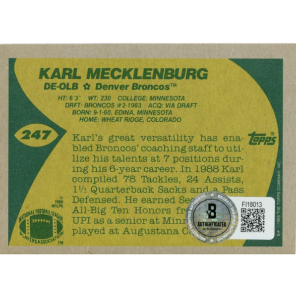 The number in the listing title is just an inventory sku for our records and is not the authentication number. The item pictured is the exact item you will receive, please see photos for condition. This is a Denver Broncos 1989 Topps #247 Trading Card that was personally autographed by Karl Mecklenburg. Includes a certificate of authenticity from Beckett Authentication Services (BAS) and Denver Autographs. FREE SHIPPING within the USA on orders over $99!
