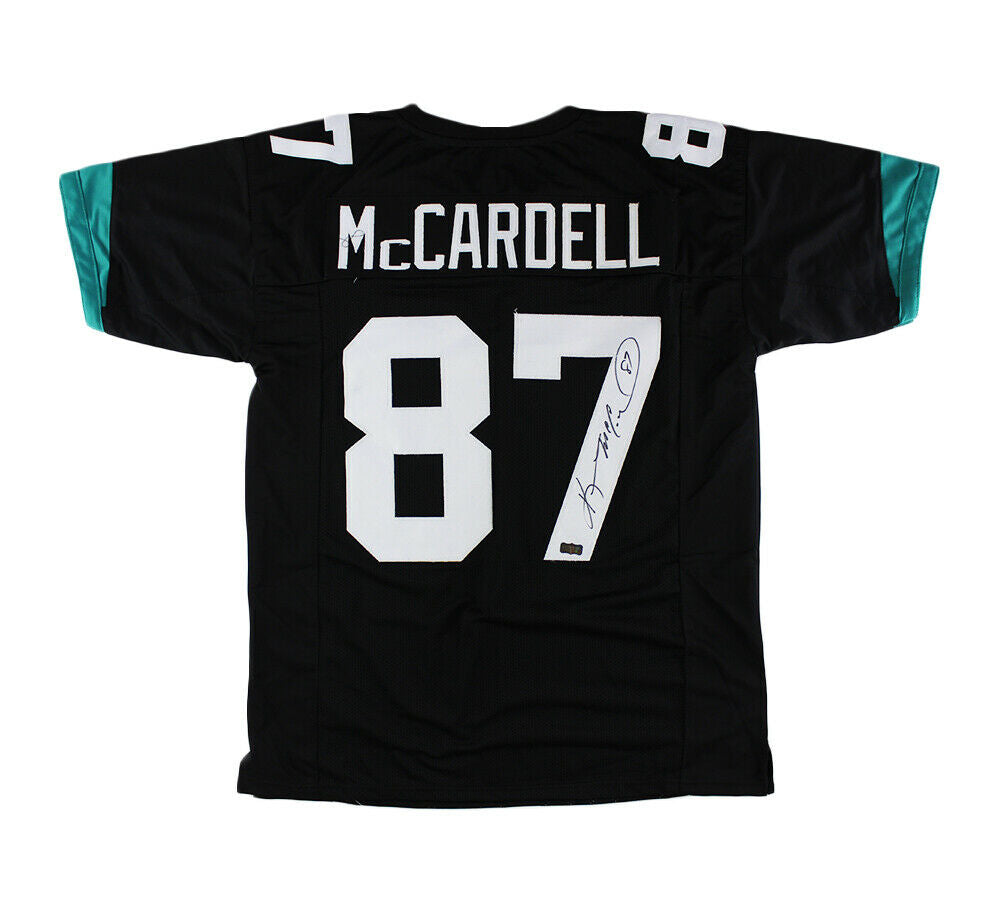 A Jacksonville Custom Black Jersey hand signed by Keenan McCardell. The item and signature are in excellent condition. Keenan was drafted into the NFL 1991, Round:12,Pick:326.Keenan 2x Pro Bowl (1996,2003). Keenan 2xSuper Bowl Champion (XXVI,XXXVII). Keenan is 10,000 Receiving Yards Club. Keenan a First-team All-Big West (1990). AUTHENTICATION: The item has been tagged with a SmarTag powered by Prova Technology, which gives you digital access to the items authentication records, including a proof picture from the signing.
