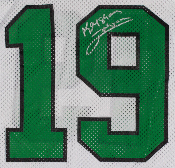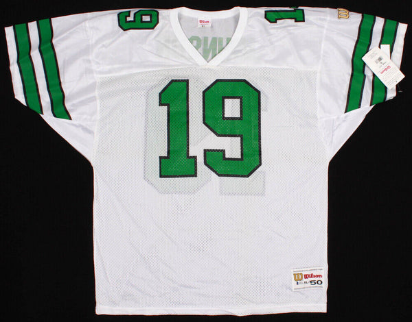 Custom replica football jersey, roughly sized L-XL. The jersey features professionally sewn letters and numbers. The jersey has no official logos, emblems, or tags and is not affiliated with a professional sports organization. The signature on the item is Beckett certified and it is intended to be sold as an autographed sport collectible.
