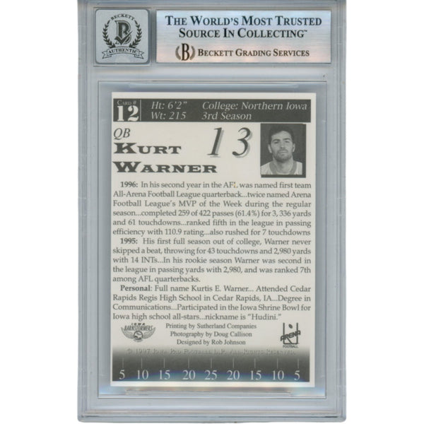 The number in the listing title is just an inventory sku for our records and is not the authentication number. The item pictured is the exact item you will receive, please see photos for condition. This is an Iowa Barnstormers AFL #12 Slabbed Trading Card that was personally autographed by Kurt Warner. Includes a certificate of authenticity / hologram from Beckett Authentication Services (BAS) and Denver Autographs. FREE SHIPPING within the USA on orders over $10!