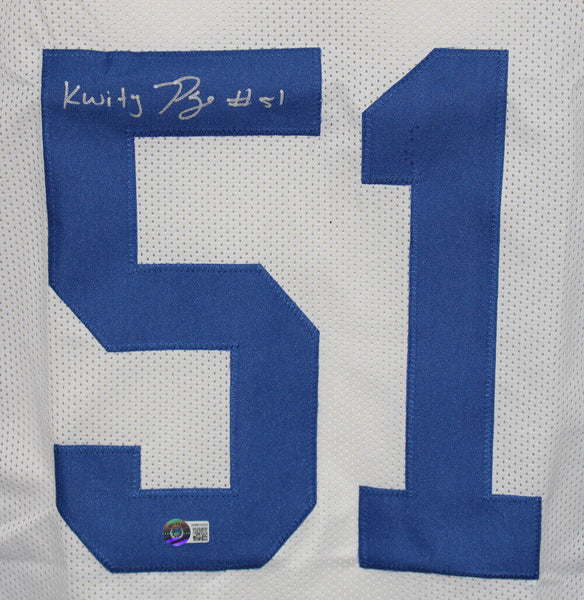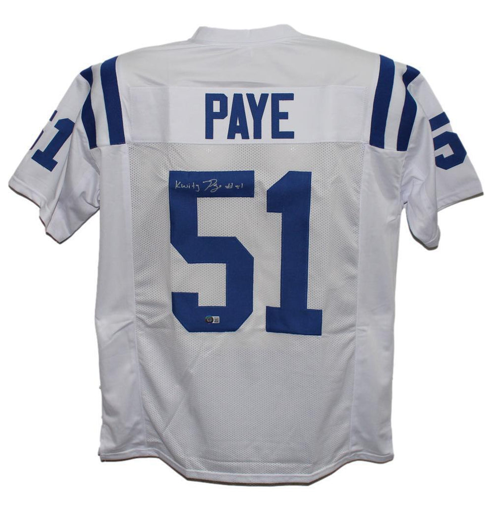 Kwity Paye Autographed/Signed Pro Style White XL Jersey Beckett 39001 The number in the listing title is just an inventory sku for our records and is not the authentication number. The item pictured is a stock photo unless otherwise noted. This is a custom pro style white XL jersey with sewn on name and numbers that was personally autographed by Kwity Paye. Includes a certificate of authenticity from Beckett Authentication Services (BAS) and Denver Autographs.