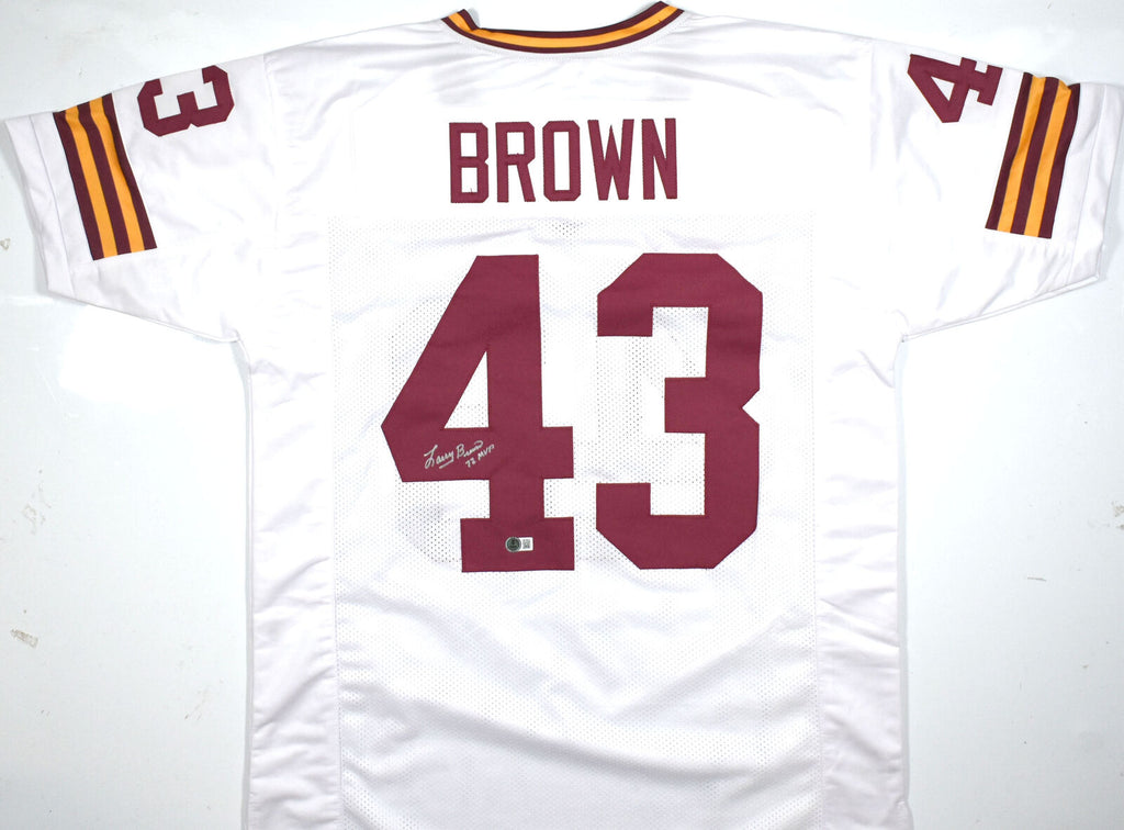 THIS IS NOT AN NFL JERSEY. THIS HAS NO TAGS, NO LOGOS, NO EMBLEMS. This is a hand autograph of Larry Brown on a custom (Non Name Brand) Authentic style Jersey with stitched letters and numbers. Inscribed 72 MVP. This item has a Beckett Witnessed Authentication, which comes with a Beckett numbered sticker hologram and a QR code for verification. You can view this item on the Beckett Authentication website, it shows when and where the item was signed. It was signed either at a public autograph appearance or a private signing. This is a stock photo of the item. Although you may not receive this exact item, the item you receive is virtually identical, brand new, and in great shape. Jersey size is XL. THIS IS NOT AN NFL JERSEY. THIS HAS NO TAGS, NO LOGOS, NO EMBLEMS. This is a hand autograph of Larry Brown on a custom (Non Name Brand) Authentic style Jersey with stitched letters and numbers. Inscribed 72 MVP. This item has a Beckett Witnessed Authentication, which comes with a Beckett numbered sticker hologram and a QR code for verification. You can view this item on the Beckett Authentication website, it shows when and where the item was signed. It was signed either at a public autograph appearance or a private signing. This is a stock photo of the item. Although you may not receive this exact item, the item you receive is virtually identical, brand new, and in great shape. Jersey size is XL.
