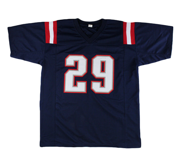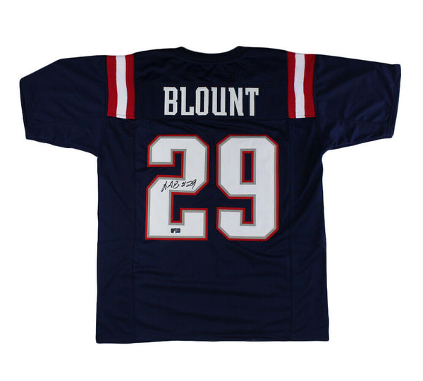 A New England Custom Navy Blue Jersey hand signed by LeGarrette Blount. The item and signature are in excellent condition. LeGarrette is a former running back who played in the NFL for nine seasons. Blount rushed for over 1,000 yards in each of his two seasons in junior college. He then committed to the Oregon Ducks football program as a junior, for the 2008 season. That year, he ran for over 1,000 yards and scored a school-record 17 touchdowns. He entered the NFL as an undrafted free agent with the Tennessee Titans in 2010, but joined the Tampa Bay Buccaneers before the start of the 2010 NFL season. He also played for the Pittsburgh Steelers in 2014, between his two stints with the New England Patriots, followed by the Philadelphia Eagles in 2017 and the Detroit Lions in 2018. AUTHENTICATION: The item is accompanied by a Certificate of Authenticity - Serial Numbered and Databased Hologram - Picture of LeGarrette from the signing