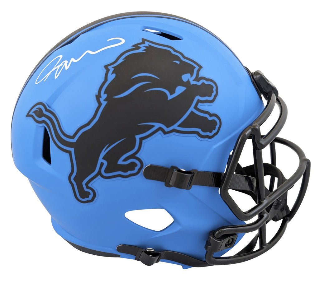 This Autographed Alternate Rave Riddell Full Size Speed Rep Helmet has been Personally Signed by Jameson Williams of the Detroit Lions. This item is 100% Authentic to include a hologram by Beckett Authentication Services. This item will come with an affixed Beckett Authentication Services (BAS) authentication sticker, which includes a scannable QR code to verify authenticity. Please note that Beckett no longer provides serial-numbered COA cards, and the attached BAS sticker will serve as the complete authentication for this item. This is a BAS Witnessed Protection Program item which means a Beckett Authentication Service representative was present when this item was being signed. We conducted an autograph signing with Jameson Williams where multiples of the same item were signed. While the photographs are representative of this item, the size, placement and strength of the signature may vary. Each item is hand signed, therefore, each autograph is unique. This item can be verified through BAS Witnessed.