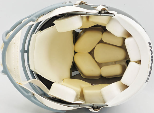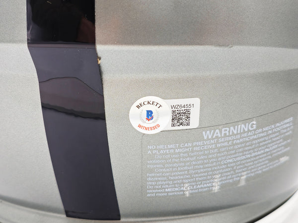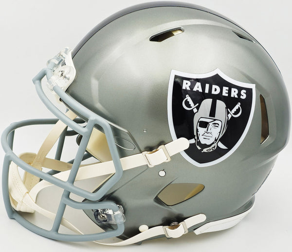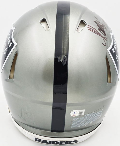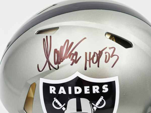 This is a Los Angeles Raiders Flash Silver Full Size Authentic Speed Helmet that has been hand signed by Marcus Allen. The Flash helmets are delicate and may have some marks or scratches on them. This item was inscribed "HOF 03." This item has been witnessed and certified authentic by Beckett Authentication (BAS) and comes with their tamper-proof witness sticker.