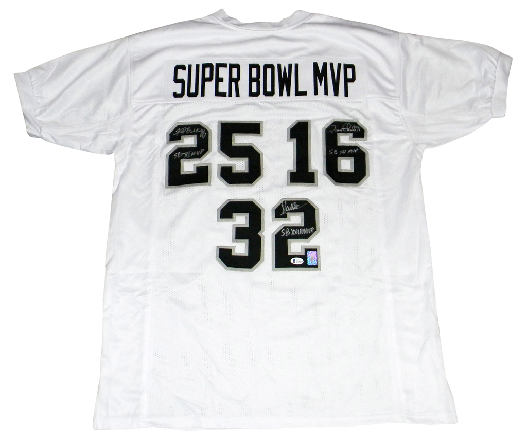 This custom jersey has been hand signed by the 3 Oakland Raiders Super Bowl MVPs; Marcus Allen, Fred Biletnikoff and Jim Plunkett. Each player included his SB MVP inscription. Jersey is size XL and all letters/numbers are sewn-on. This item comes with a certificate of authenticity (COA) from Beckett Authentication Services and was signed in the presence of one of their representatives. You will receive a serial-numbered COA along with a matching serial-numbered sticker on the jersey. The authenticity can be verified online by entering the serial number.Item pictured may not be the exact item you will receive. It will be similar quality, and we guarantee your satisfaction.