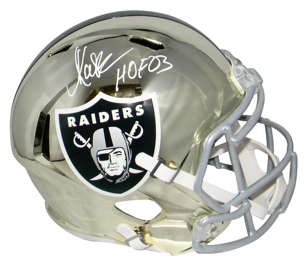 Marcus Allen, former Hall of Fame running back for the Oakland Raiders, has hand signed this Raiders Riddell Speed Chrome full-size replica helmet at a private signing. He included the inscription "HOF 03". This item comes with a certificate of authenticity (COA) from Beckett Authentication Services and was signed in the presence of one of their representatives. You will receive a serial-numbered COA along with a matching serial-numbered sticker on the helmet. The authenticity can be verified online by entering the serial number.Item pictured may not be the exact item you will receive. It will be similar quality, and we guarantee your satisfaction.
