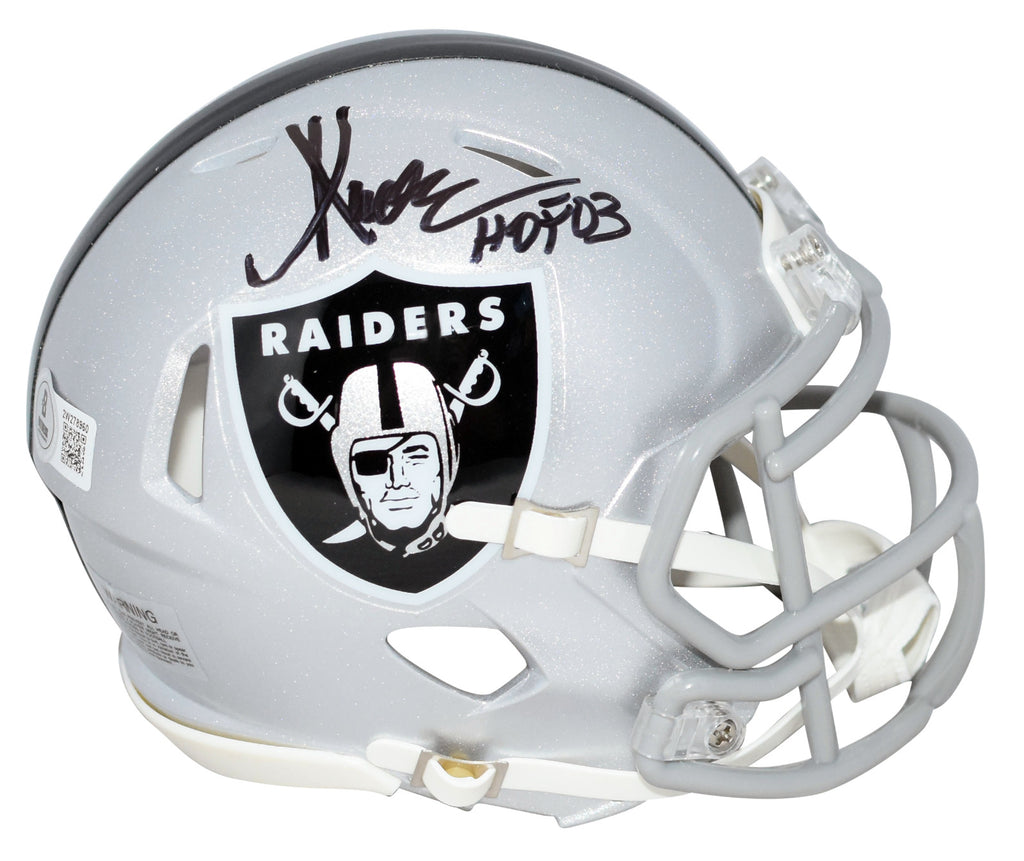 Marcus Allen, former Hall of Fame running back for the Oakland Raiders, has hand signed this Raiders Riddell Speed mini helmet at a private signing. He included the inscription "HOF 03" with his signature. This item is authenticated by Beckett Authentication Services and was signed in the presence of one of their representatives. Their tamper-evident hologram featuring a QR code and serial number is on the item. The authenticity can be verified online by entering the serial number or scanning the QR code.Item pictured may not be the exact item you will receive. It will be similar quality, and we guarantee your satisfaction.