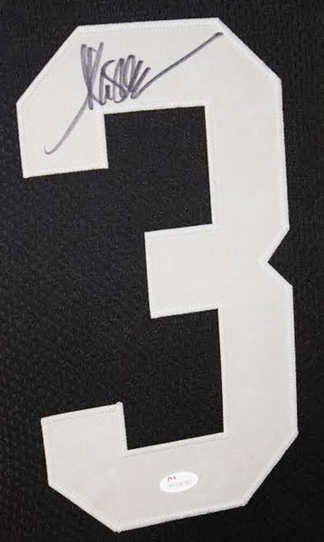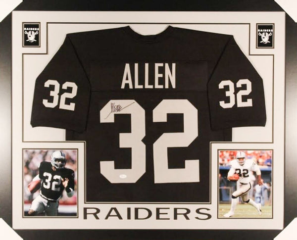 Custom frame measures approximately 35" x 43" in size and features a jersey which has been hand-signed in black felt-tip pen by Marcus Allen (HOF). The autograph includes an official James Spence Authentication (JSA) hologram and matching COA for authenticity purposes. The signing of this item was witnessed by JSA.Authentication: JSA COA