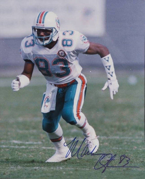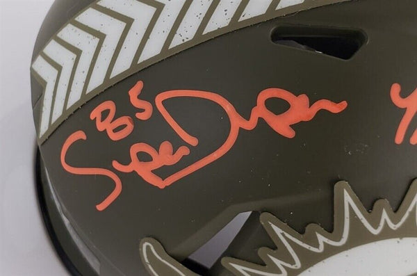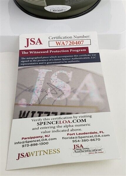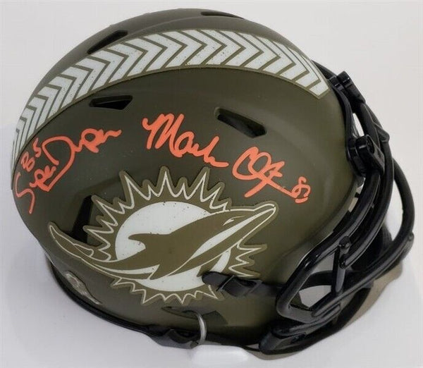 This autographed Riddell Salute to Service Speed mini helmet has been personally hand-signed by Mark Clayton and Mark 'Super' Duper of the Miami Dolphins. These autographs are certified by James Spence Authentication's (JSA) Witnessed Protection Program. That means that a JSA representative was present when this item was signed. The helmet comes with the numbered hologram and matching Certificate of Authenticity.