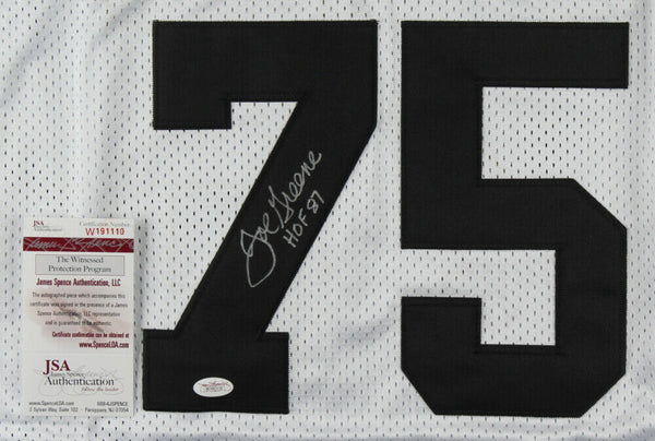 Mitchell & Ness on-field style jersey. Everything is sewn on, size XL. Hand-signed and inscribed by Joe Greene (Pittsburgh Steelers, HOF).The lot / autograph(s) includes an official James Spence Authentication (JSA) hologram and matching COA for authenticity purposes. The signing of this item was witnessed by JSA.Authentication: JSA COA