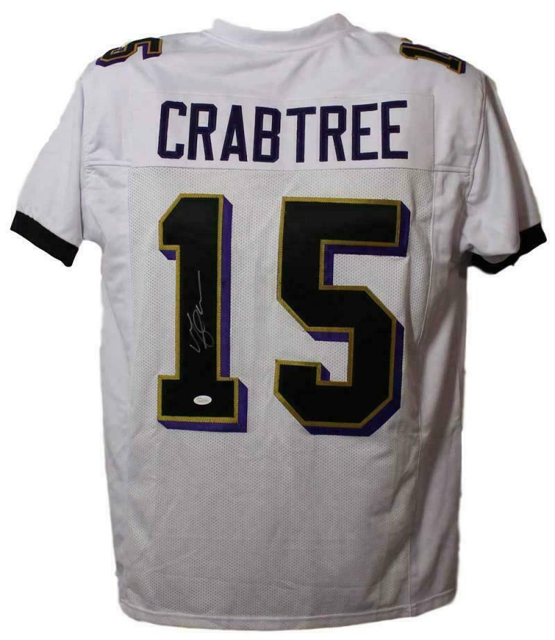 Michael Crabtree Autographed/Signed Baltimore Ravens XL White Jersey JSA 22436 This is a custom size XL white jersey with sewn on name and numbers that was personally signed by Michael Crabtree. This jerseyincludes a certificate of authenticity from James Spence Authentication (JSA) and Denver Autographs.