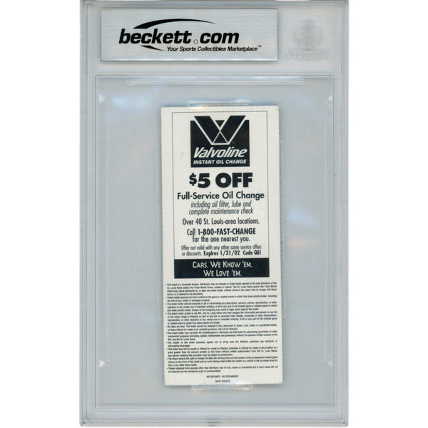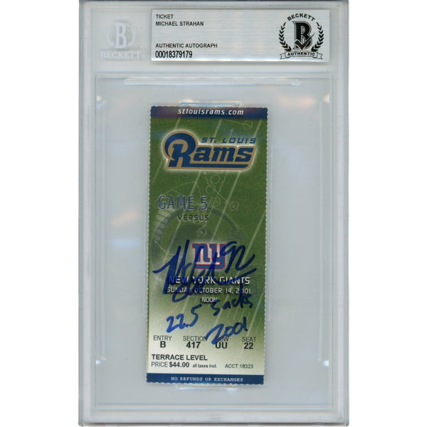 The number in the listing title is just an inventory sku for our records and is not the authentication number. The item pictured is the exact item you will receive, please see photos for condition. This is a New York Giants vs Rams October 14, 2001 Slabbed Ticket Stub that was personally autographed by Michael Strahan includes "22.5 Sacks 2001" inscription. Includes a certificate of authenticity / hologram from Beckett Authentication Services (BAS) and Denver Autographs. FREE SHIPPING within the USA on orders over $10!