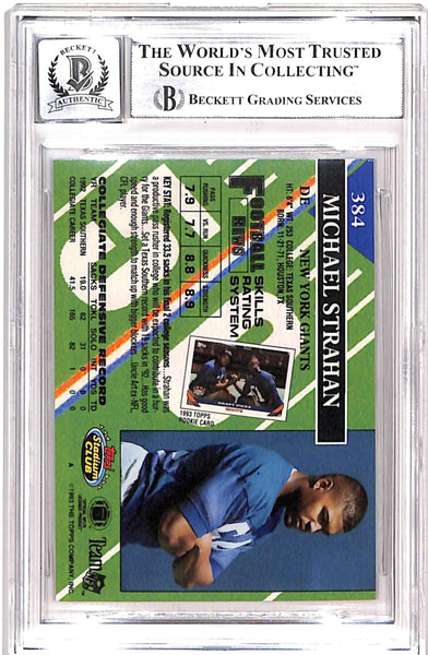 Michael Strahan Signed 1993 Stadium Club #384a 10 Auto Beckett 38971 The number in the listing title is just an inventory sku for our records and is not the authentication number. The item pictured is a stock photo unless otherwise noted. This is a slabbed 1993 Stadium Club #384a Trading Card with a Grade 10 Autograph that was personally autographed by Michael Strahan. Includes a certificate of authenticity from Beckett Authentication Services (BAS) and Denver Autographs.