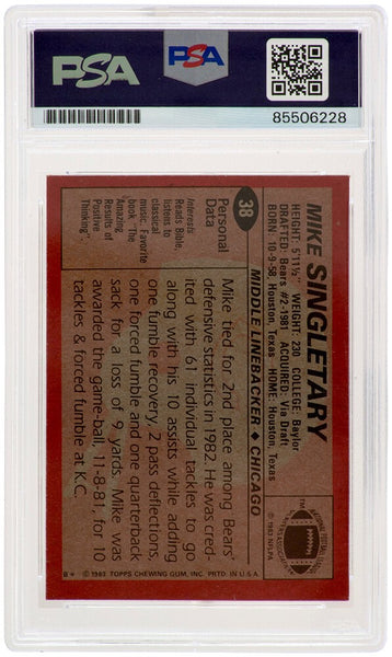 Mike Singletary signed Chicago Bears 1983 Topps rookie football trading card #38 with 'HOF 98' inscription. The card has been authenticated and encapsulated by PSA/DNA and the number can be verified online.