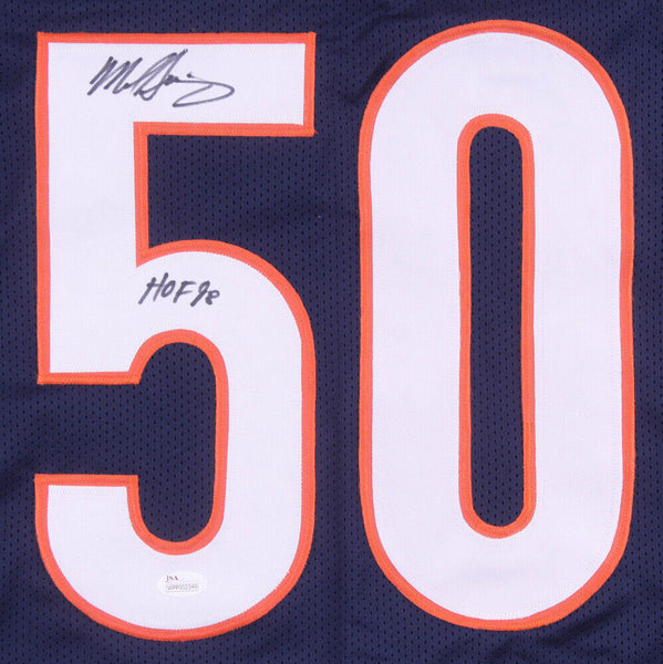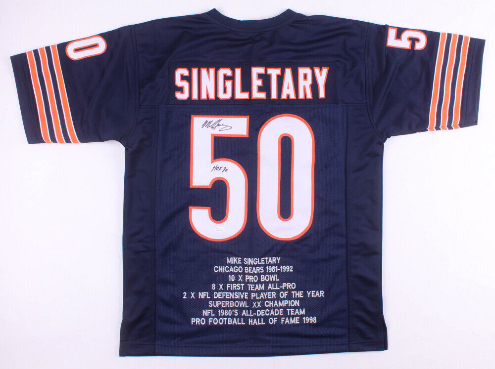 Custom on-field style jersey. Everything is sewn on, size XL. Hand-signed and inscribed in black felt-tip pen by Mike Singletary (HOF). Singletary's career highlights have been custom stitched onto the back of the jersey below the reverse numbers. Singletary was drafted by the Chicago Bears in the 2nd round of the 1981 NFL Draft and was known as "The Heart of the Defense" for the Chicago Bears' Monsters of the Midway in the mid-1980s. He was inducted into the Pro Football Hall of Fame in 1998. The lot / autograph(s) includes an official James Spence Authentication (JSA) hologram and matching COA for authenticity purposes. The signing of this item was witnessed by JSA.Authentication: JSA COA