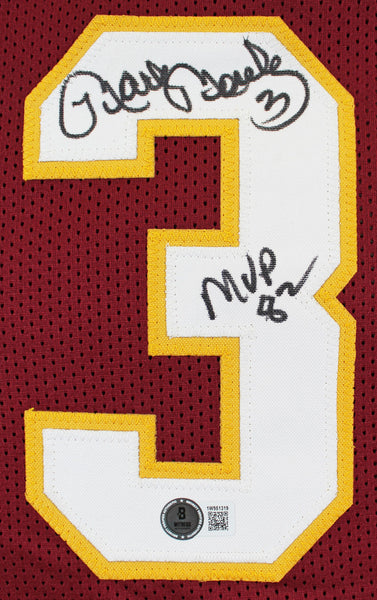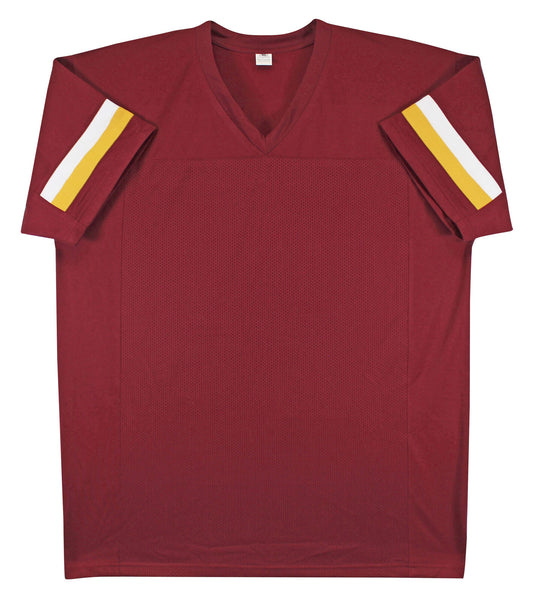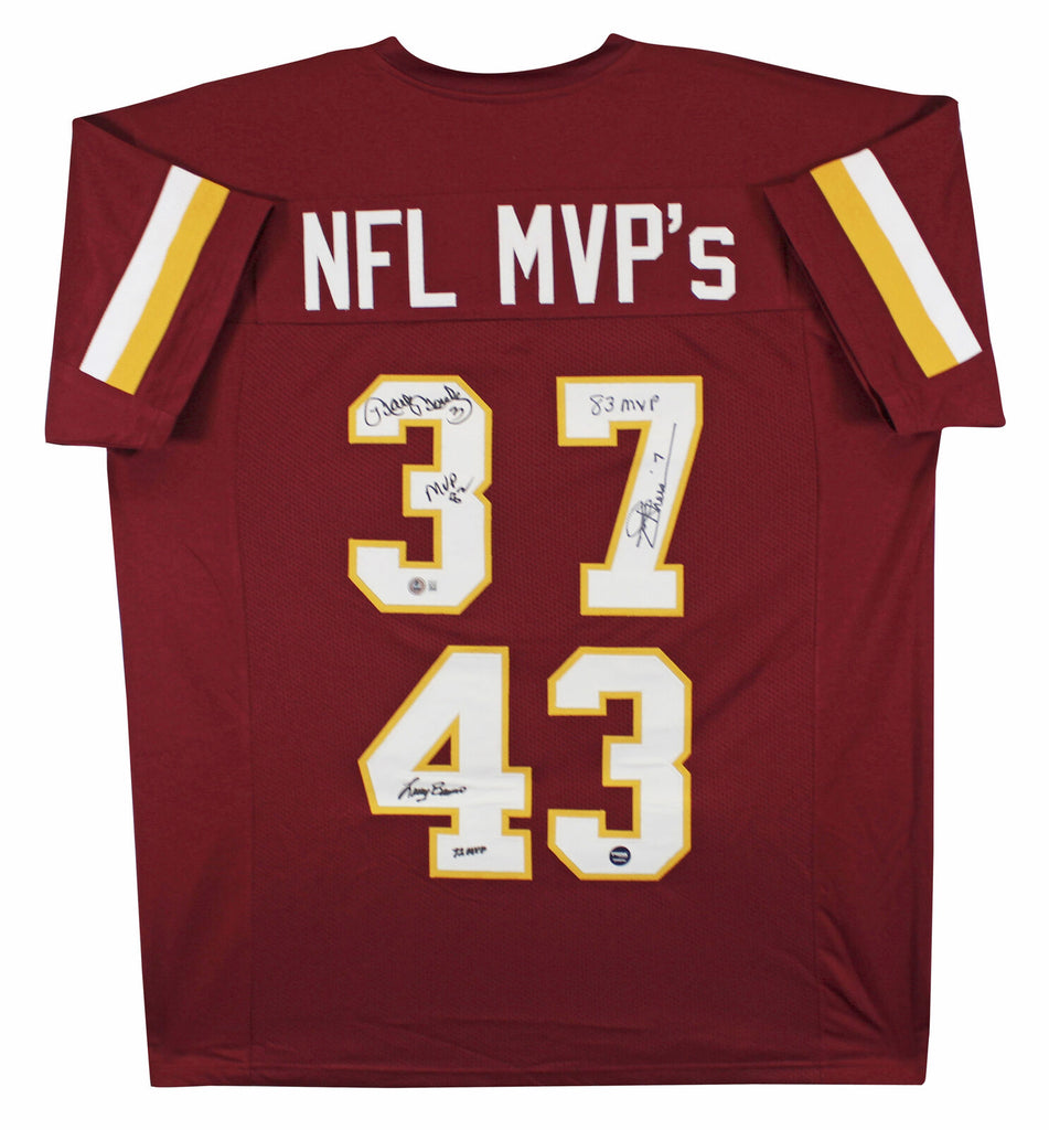 This Autographed Maroon Pro Style Jersey with the inscription of "83 NVL MVP (Theismann), 82 NFL MVP (Mosely), 72 NFL MVP (Brown)" has been Personally Signed by Joe Theismann, Mark Mosely, & Larry Brown of the Washington Redskins. This item is 100% Authentic to include a hologram by Beckett Authentication Services. This item will come with an affixed Beckett Authentication Services (BAS) authentication sticker, which includes a scannable QR code to verify authenticity. Please note that Beckett no longer provides serial-numbered COA cards, and the attached BAS sticker will serve as the complete authentication for this item. This is a BAS Witnessed Protection Program item which means a Beckett Authentication Service representative was present when this item was being signed. We conducted an autograph signing with Joe Theismann, Mark Mosely, & Larry Brown where multiples of the same item were signed. While the photographs are representative of this item, the size, placement and strength of the signature may vary. Each item is hand signed, therefore, each autograph is unique. This item can be verified through BAS Witnessed. This is a X-Large sized, non-branded, custom-stitched Jersey.