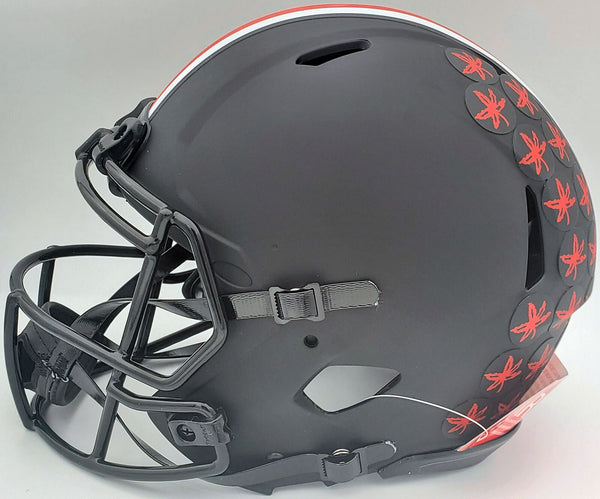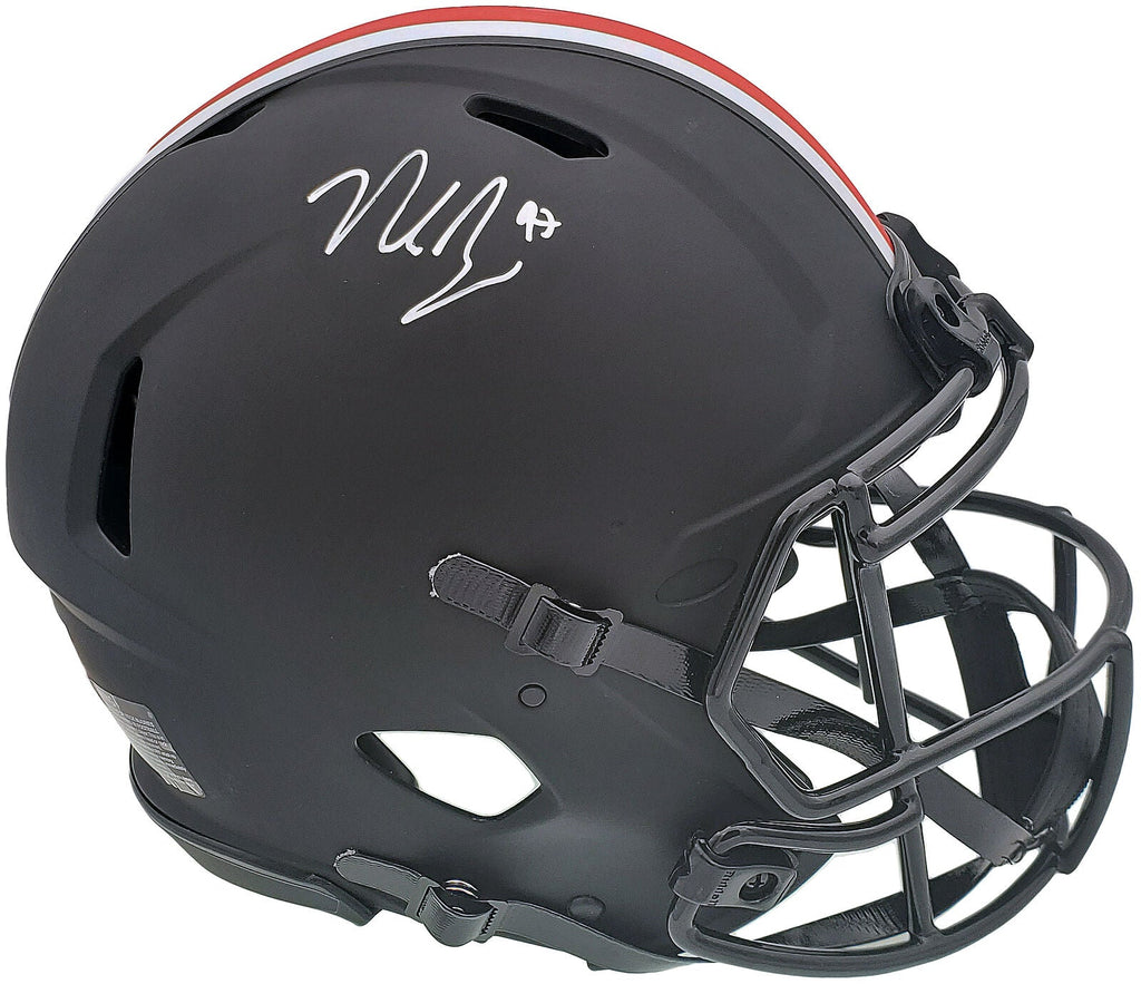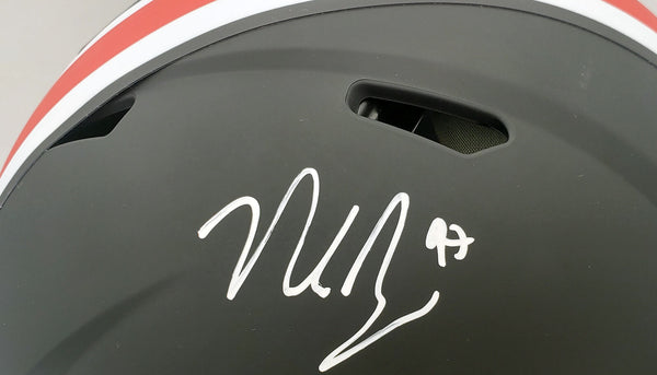This is an Ohio State Buckeyes Eclipse Black Full Size Authentic Speed Helmet that has been hand signed by Nick Bosa. The Eclipse helmets are very delicate and often have some marks or scratches on them. This item has been certified authentic by Beckett Authentication (BAS) and comes with their tamper-proof QR Code sticker that can be verified on the Beckett-authentication.com.
