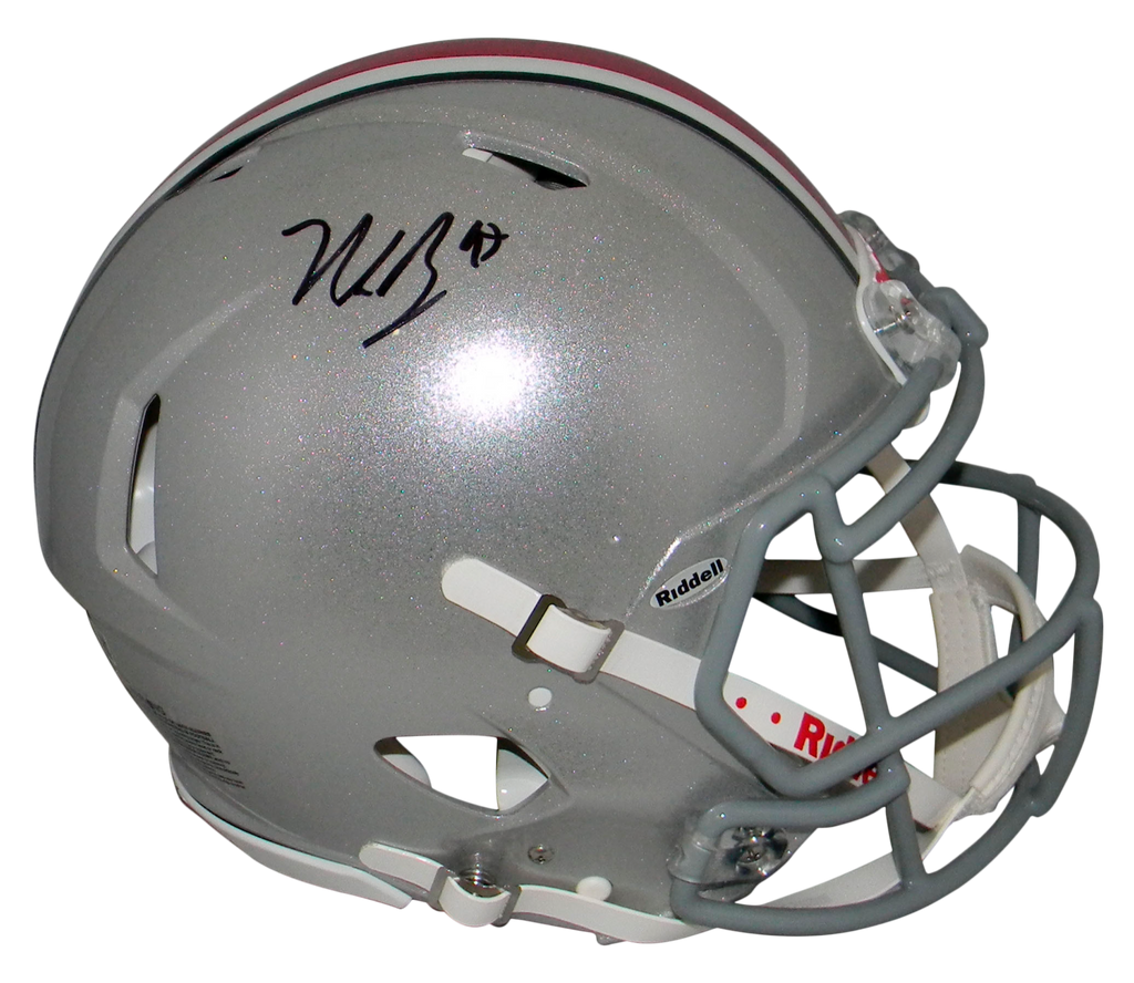 Nick Bosa, former All-American defensive end for the Buckeyes, has hand signed this Ohio State Riddell Speed full-size authentic helmet at a private signing. This helmet is fully padded inside like the ones worn on the field. This item is authenticated by Beckett Authentication Services and was signed in the presence of one of their representatives. Their tamper-evident hologram featuring a QR code and serial number is on the item. The authenticity can be verified online by entering the serial number or scanning the QR code.Item pictured may not be the exact item you will receive. It will be similar quality, and we guarantee your satisfaction.