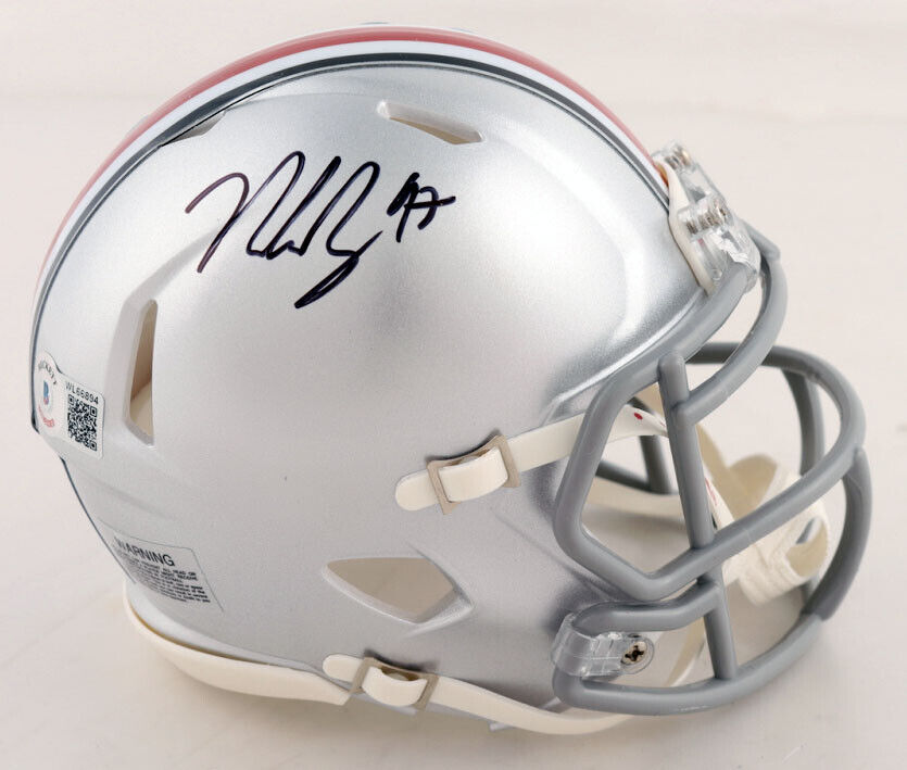 Nick Bosa, former All-American defensive end for the Buckeyes, has hand signed this Ohio State Riddell Speed mini helmet at a private signing. This item is authenticated by Beckett Authentication Services and was signed in the presence of one of their representatives. Their tamper-evident hologram featuring a QR code and serial number is on the item. The authenticity can be verified online by entering the serial number or scanning the QR code.Item pictured may not be the exact item you will receive. It will be similar quality, and we guarantee your satisfaction.